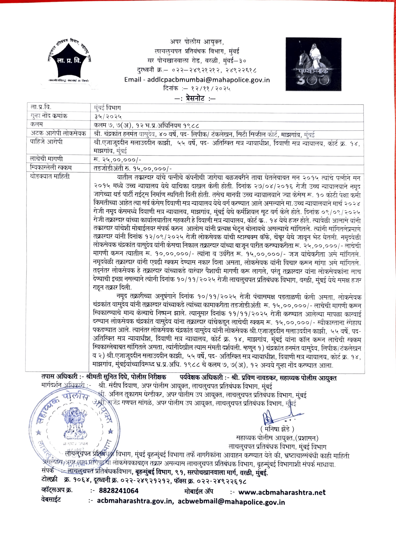 Today Court staff who was demanding easy corrupt bribe from member of public was caught Red Handed by members of Anti Corruption Bureau of Mumbai Unit at Holy Mazgaon Court. Though informed member of public about the said trapped Court staff we got very disturbing feedback from Public as public honestly felt this trap may be of some court staff to do some work but imagine when in the house of Justice Gupta of Delhi High Court where Crores of Rupees found which in fact were found in burning condition. Still today no FIR is registered against said Justice Shri Verma and no proceedings of Disproportionate Assets were launched agsinst him. In short people of this State lost faith of outcome of such trapped cases. Today it is just BREAKING NEWS of ACB office. At of the day when public feel secure that corrupt public servants are resting behind the bar for long period of time.